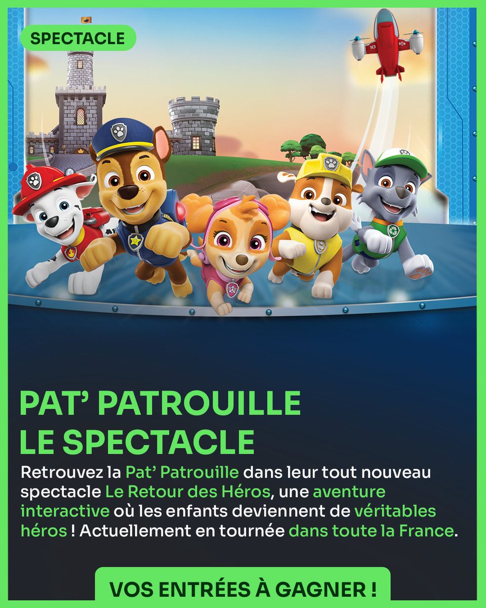 💫 Vos places à gagner pour assister au Retour des Héros, le nouveau spectacle évènement de la Pat’ Patrouille ! Plongez dans une aventure interactive où les enfants deviennent de véritables héros aux côtés de leurs chiots préférés, actuellement en tournée dans